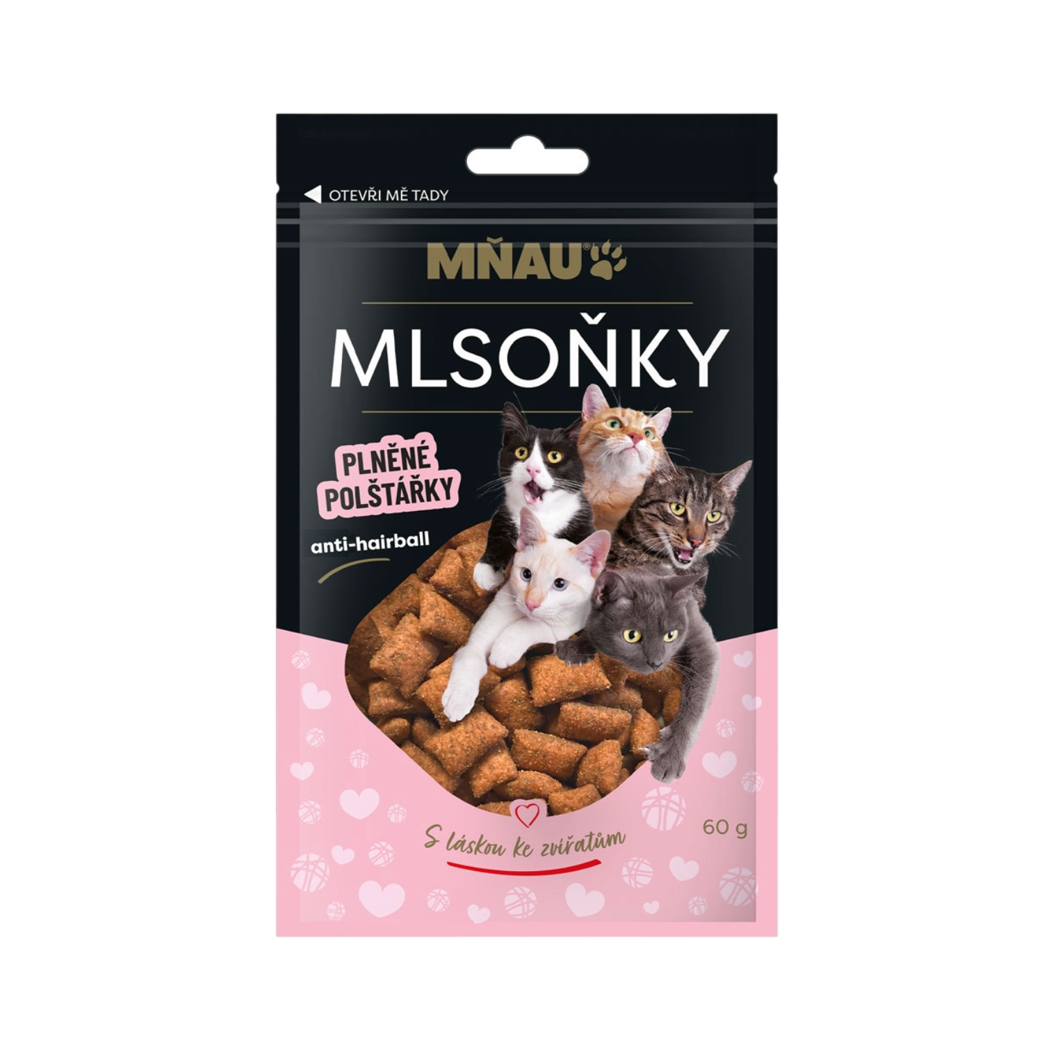 Mňau Mlsoňky (60 g): Křupavé plněné polštářky, které fungují i proti trichobezoárům.