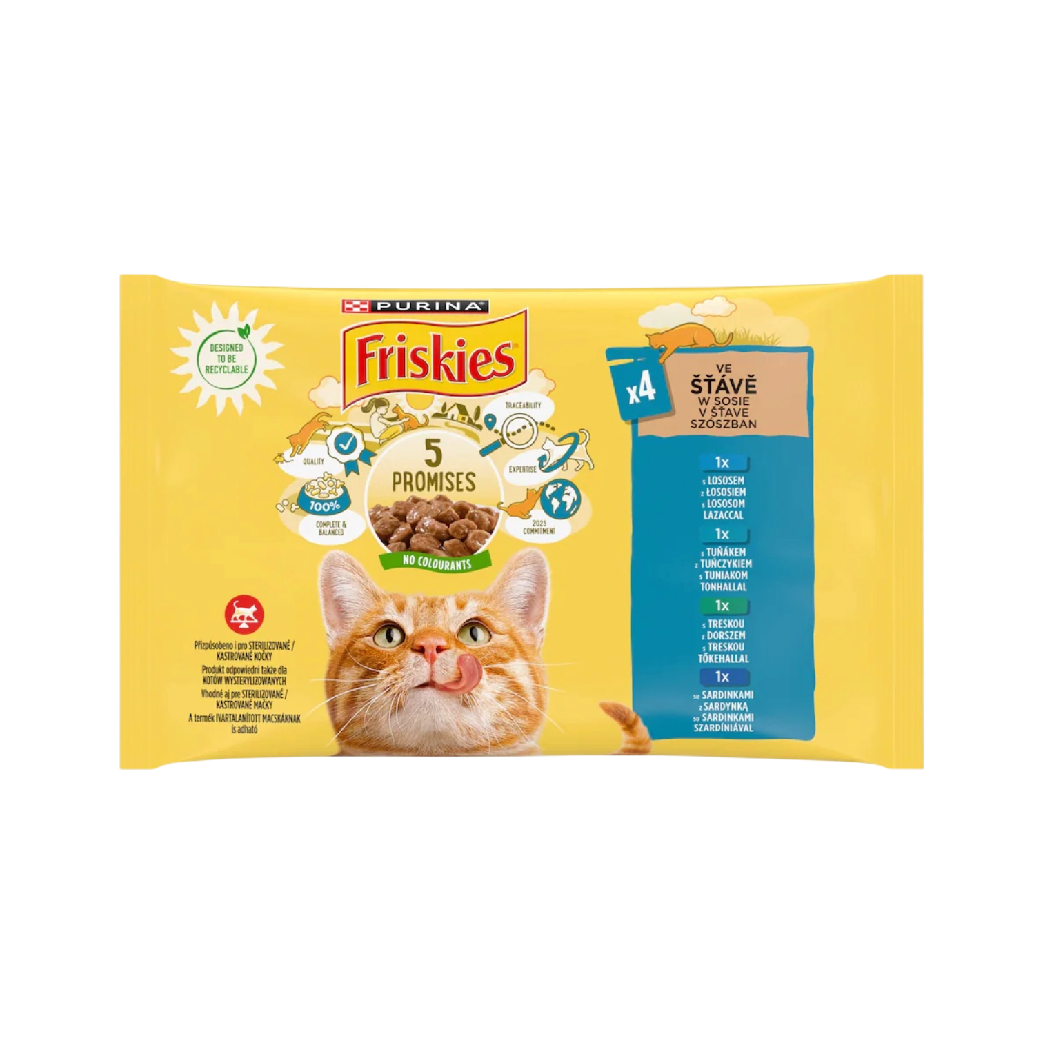 Purina Friskies 5 Promises (multipack, např. 4 kapsičky v balení): Výběr masových kousků ve šťávě pro rozmanité krmení.