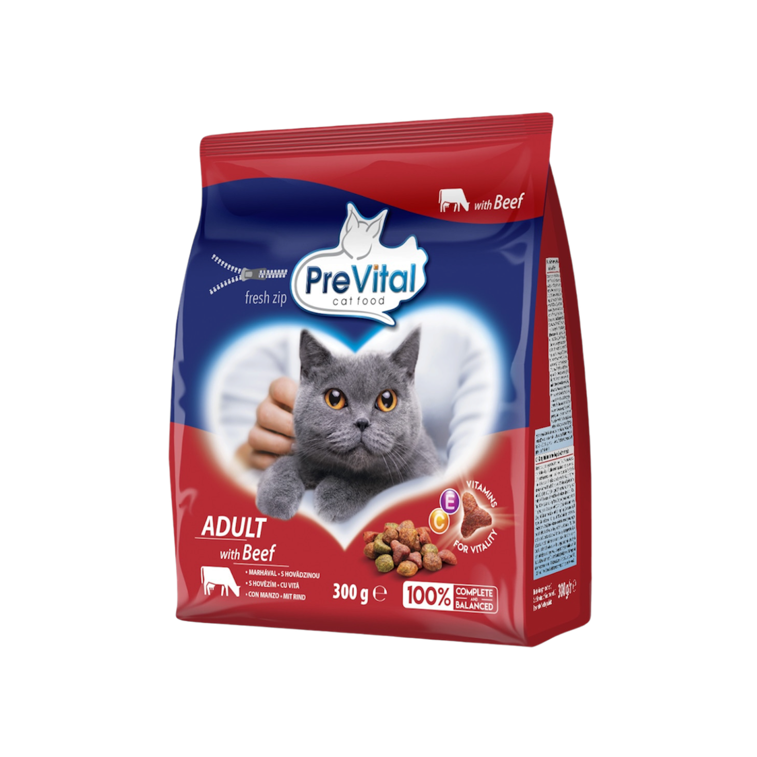 PreVital Adult with Beef (300 g): Suché krmivo s hovězím masem pro dospělé kočky. Podporuje vitalitu.