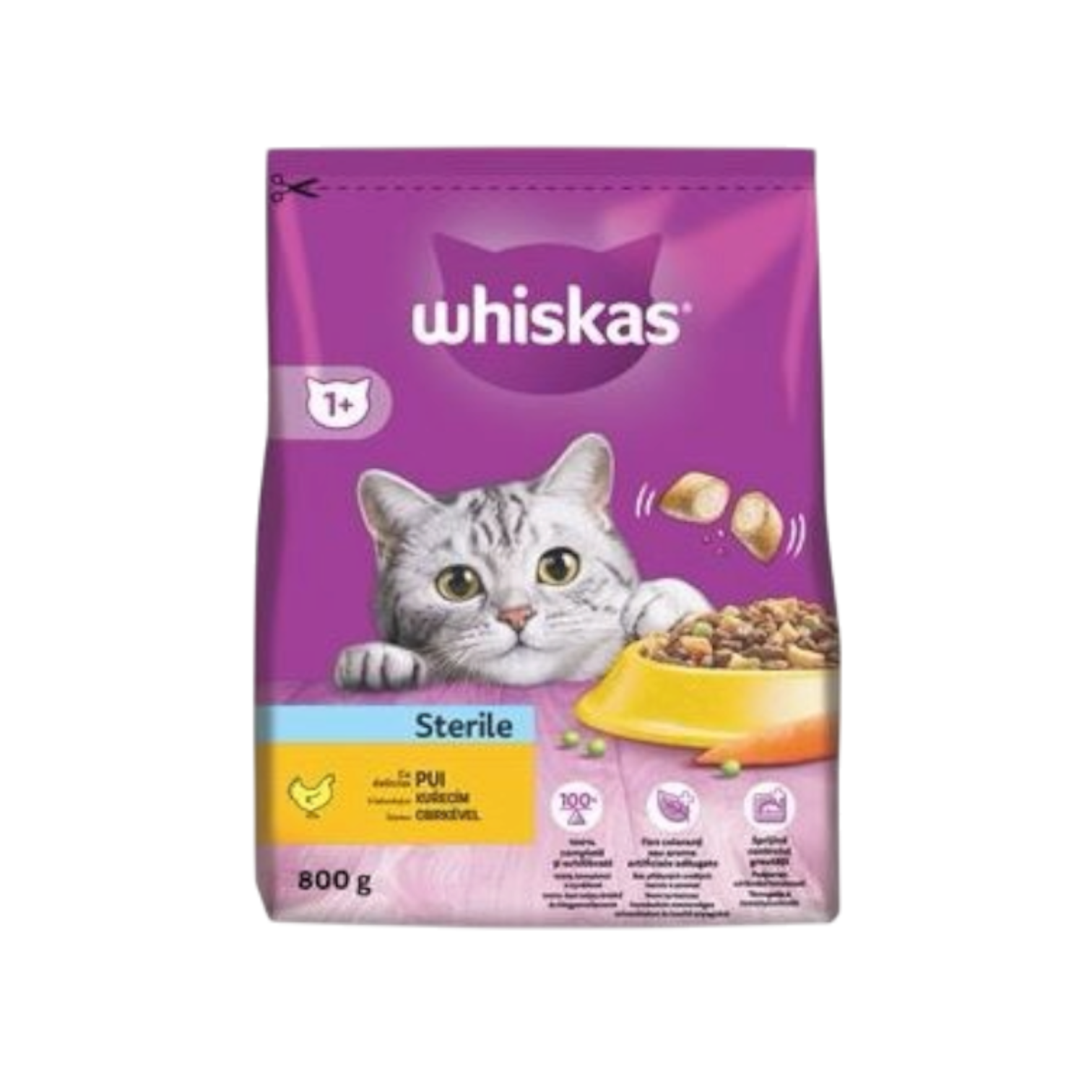Whiskas Sterile (800 g): Suché krmivo s kuřecím masem pro sterilizované kočky. Vyvážené složení pro zdravé močové cesty.