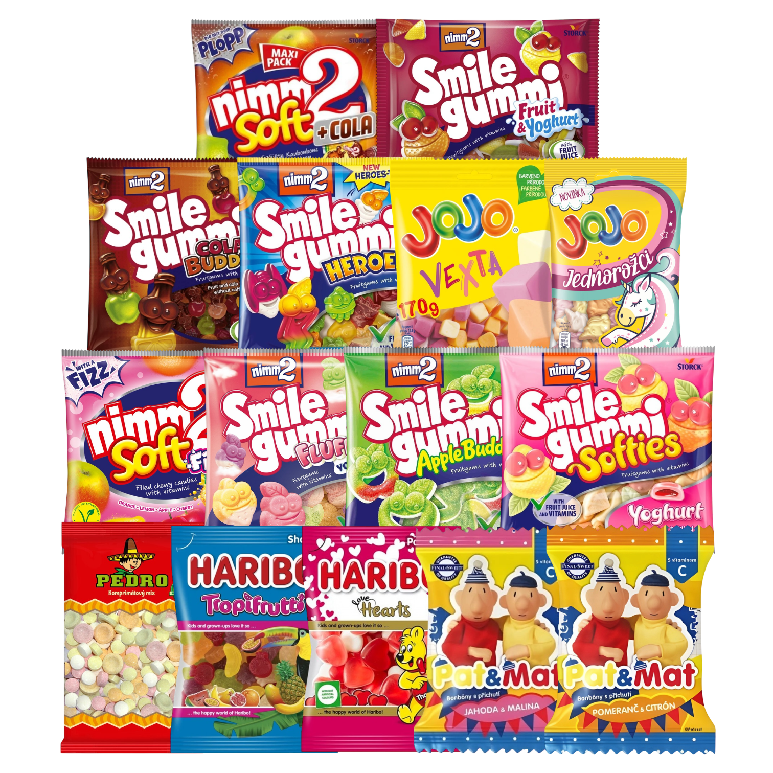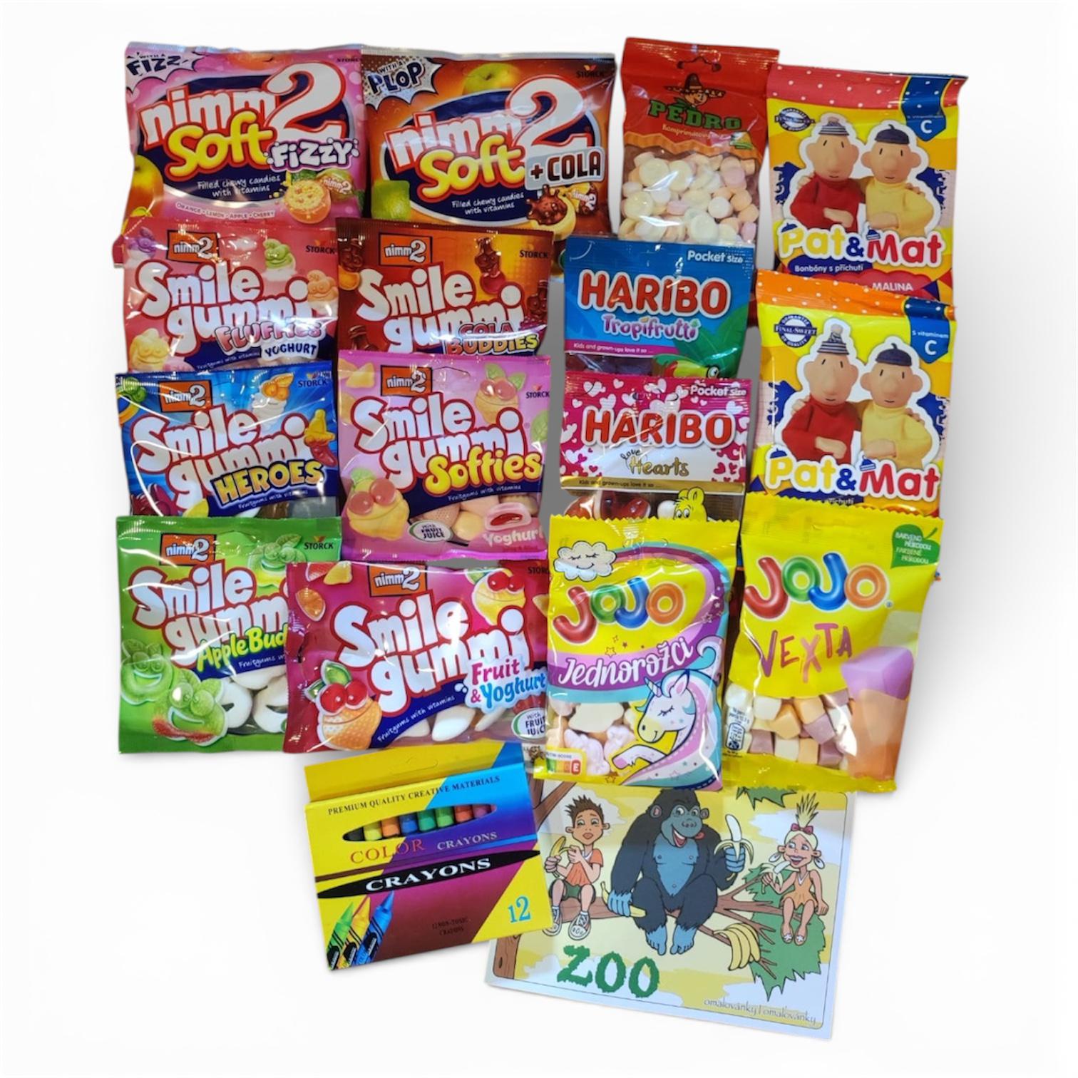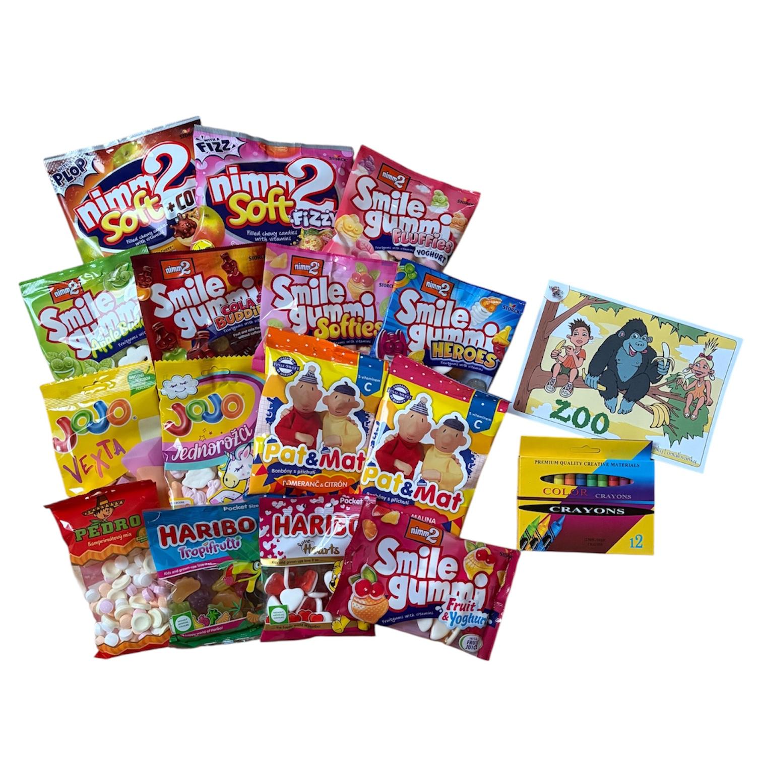 Složení setu: nimm2 Soft (Fizzy, Cola), Smile Gummi (vícero druhů), Haribo (Tropifrutti, Hearts), JOJO (Vexta, Jednorožci), Pat & Mat bonbóny, Pedro komprimát.
