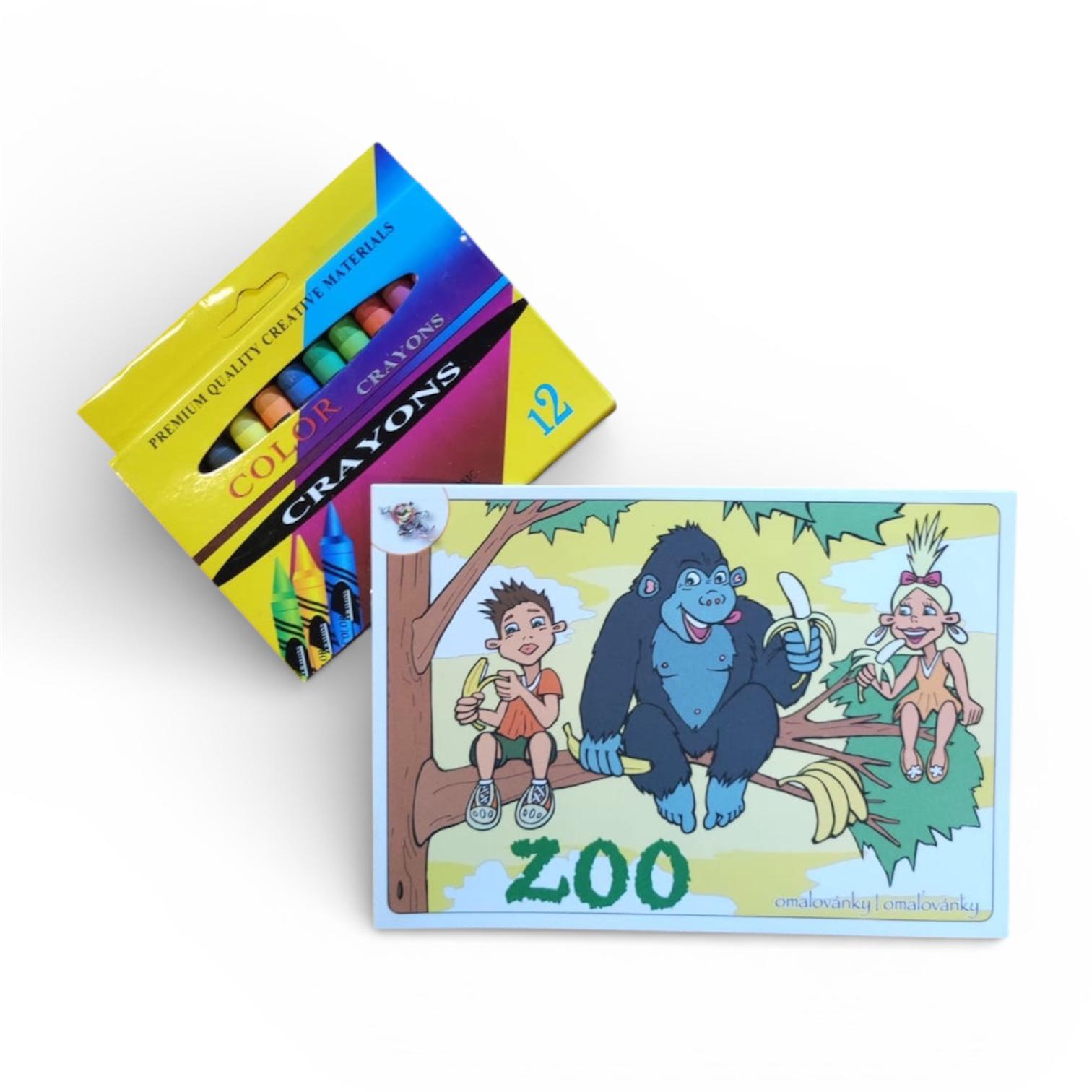 Kreativní doplňky: Sada 12 barevných voskovek (Crayons) a tematické omalovánky ZOO.