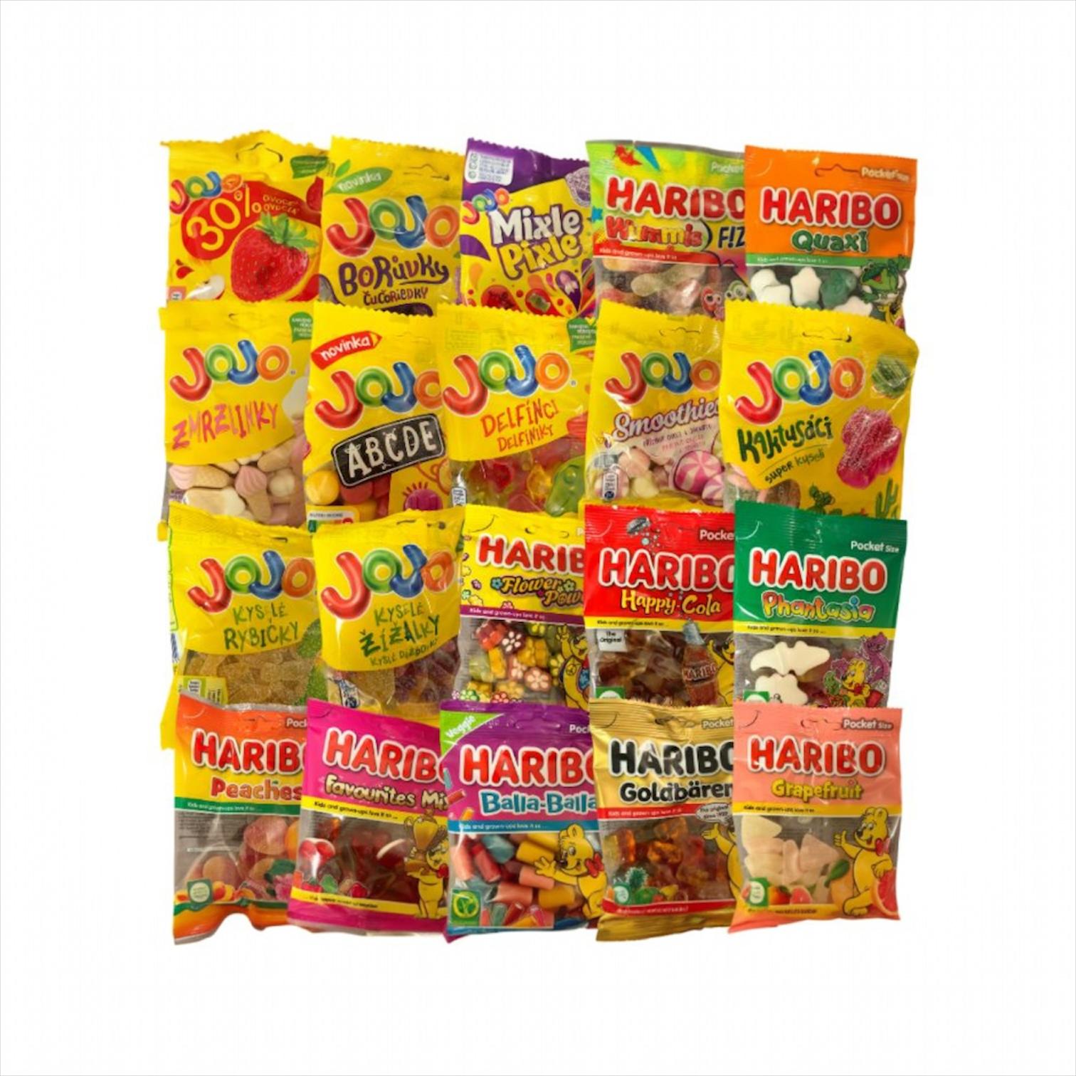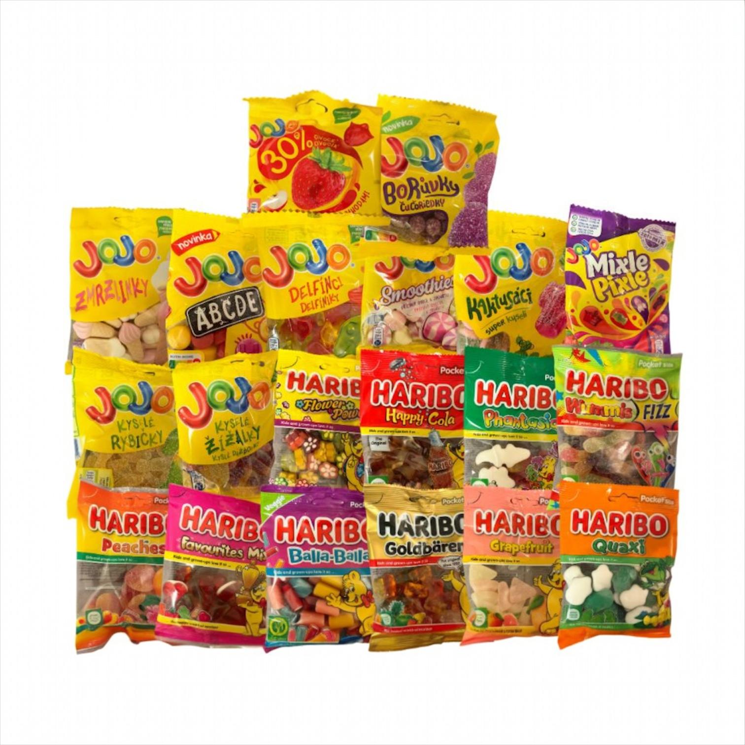 Už žádné kompromisy – v tomto balení najdete vše od legendárních medvídků Haribo až po hravé delfínky nebo kaktusáky od JOJO. Vše je čerstvé, barevné a připravené udělat radost.